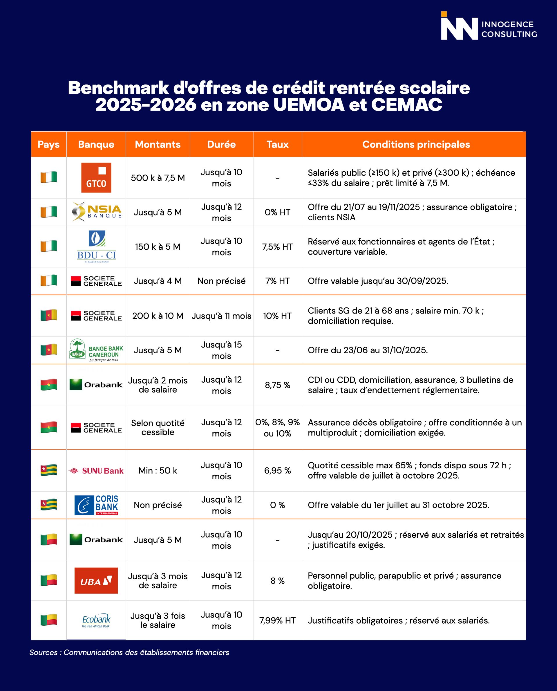 Derrière ces campagnes se joue un double enjeu : répondre à un besoin conjoncturel fort (les dépenses éducatives de juillet à octobre) tout en renforçant la captation des revenus, la domiciliation et la consommation multiproduits. La plupart des offres publiées imposent la présence d’un compte domicilié, un niveau de salaire minimal, une assurance emprunteur, et parfois des conditions d’endettement resserrées. Les durées oscillent entre 10 et 15 mois, avec des taux variant de 0 % à plus de 10 %, selon les segments visés et les stratégies de conquête.